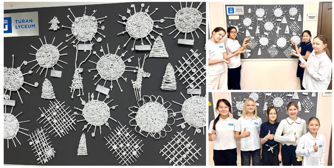 На уроках художественного труда ученицы 5-х классов с большим увлечением создавали снежинки и новогодние поделки из обычных газет. Под руководством руководителя кружка Омаровой Ляззат Сембаевны девочки осваивали необычную технику: аккуратно крутили газетные трубочки и превращали их в изящные ажурные снежинки и праздничные украшения.