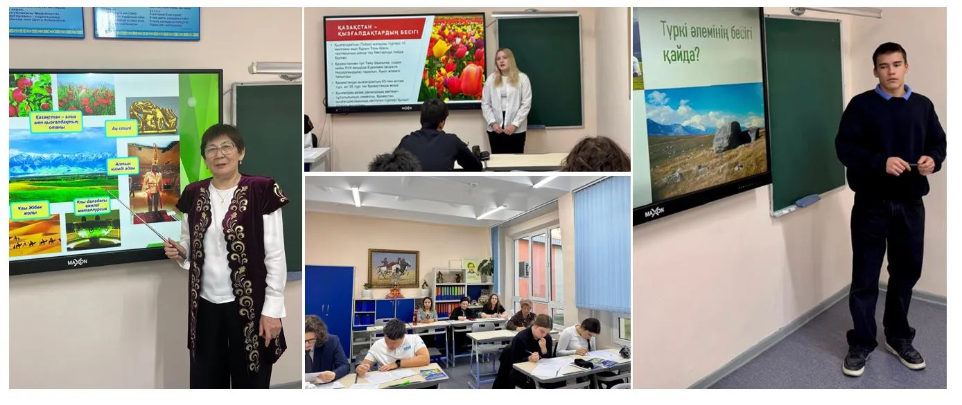В 11 А классе состоялся открытый урок Зауреш Ашимовны Ермухановой, проведенный в рамках фестиваля «Цвети, мой Казахстан!» и Недели учителей казахского языка и литературы. Урок «Ұлы Даланың жеті қыры. Рухани жаңғыру. Абайды оқы»   был основан на методе РРР (презентация, практика, продукт) и отражал тему самообразования «Формирование метапредметных компетенций через развитие коммуникативной компетентности учащихся». Занятие началось с психологической разминки, что создало теплую эмоциональную атмосферу и повысило уверенность учащихся. Все этапы урока были направлены на развитие метапредметных навыков через коммуникацию. В работе использованы проектное обучение, аргументация, анализ информации, создание собственного продукта. Интерактивная работа, мини проекты и рубрика «Сен білесің бе» помогли учащимся активизировать тематическую лексику и свободно говорить на казахском языке. Вовлечение школьников в процесс оценивания усилило их творческую активность и самостоятельность. Коммуникативные навыки формировались через приемы «ПОПС формула» и «Құнды пікір», которые развивают умение выражать позицию и аргументировать мнение. Информационные компетенции поддержали развитие творческих и интеллектуальных способностей. Рефлексия «Аяқталмаған сөйлем» помогла учащимся осмыслить собственную деятельность. В качестве домашнего задания предложена тема «Ұлы даланың жеті қыры». Рухани жаңғыру Абайды оқы». Метод РРР обеспечил достижение целей урока и создал атмосферу творческого интереса к изучению казахского языка.