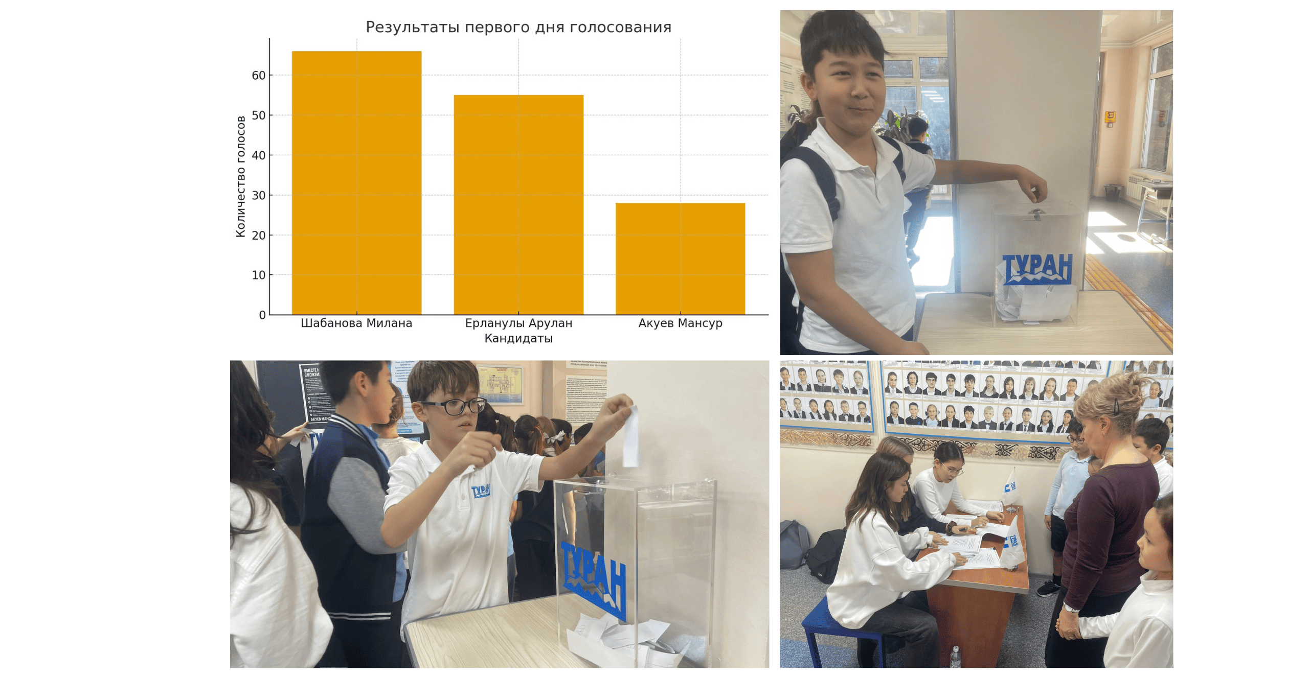 27 октября в школе «Лицей «Туран» прошел первый этап выборов президента школьного парламента. В голосовании приняли участие учащиеся 3–6 классов. Счетная комиссия подвела итоги первого дня. Шабанова Милана набрала 66 голосов. Ерланулы Арулан получил 55 голосов. Акуев Мансур получил 28 голосов. Впереди второй день голосования. Учащиеся смогут продолжить поддерживать своих кандидатов и следить за развитием выборов.