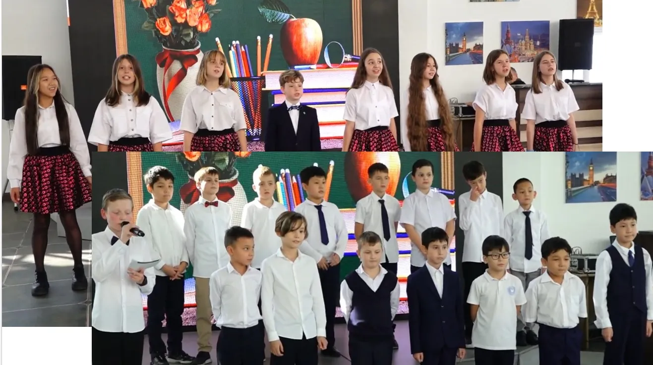 Ученики 1 «В» класса порадовали ярким зажигательным танцем. Песню «Здравствуй, школа» подарила вокальная группа «Дружные ребята». Постановка драмкружка о современных технологиях развеселила гостей. Песня «Спасибо, учитель» прозвучала в исполнении группы «Домисолька». Яркие моменты праздничного концерта- выступление хора мальчиков с песней «Господа учителя» и танцевальный номер от 3 «А». Улыбчивая, заводная Кусекбаева Адель вызвала долгие аплодисменты, исполнив песню «Улыбайся».